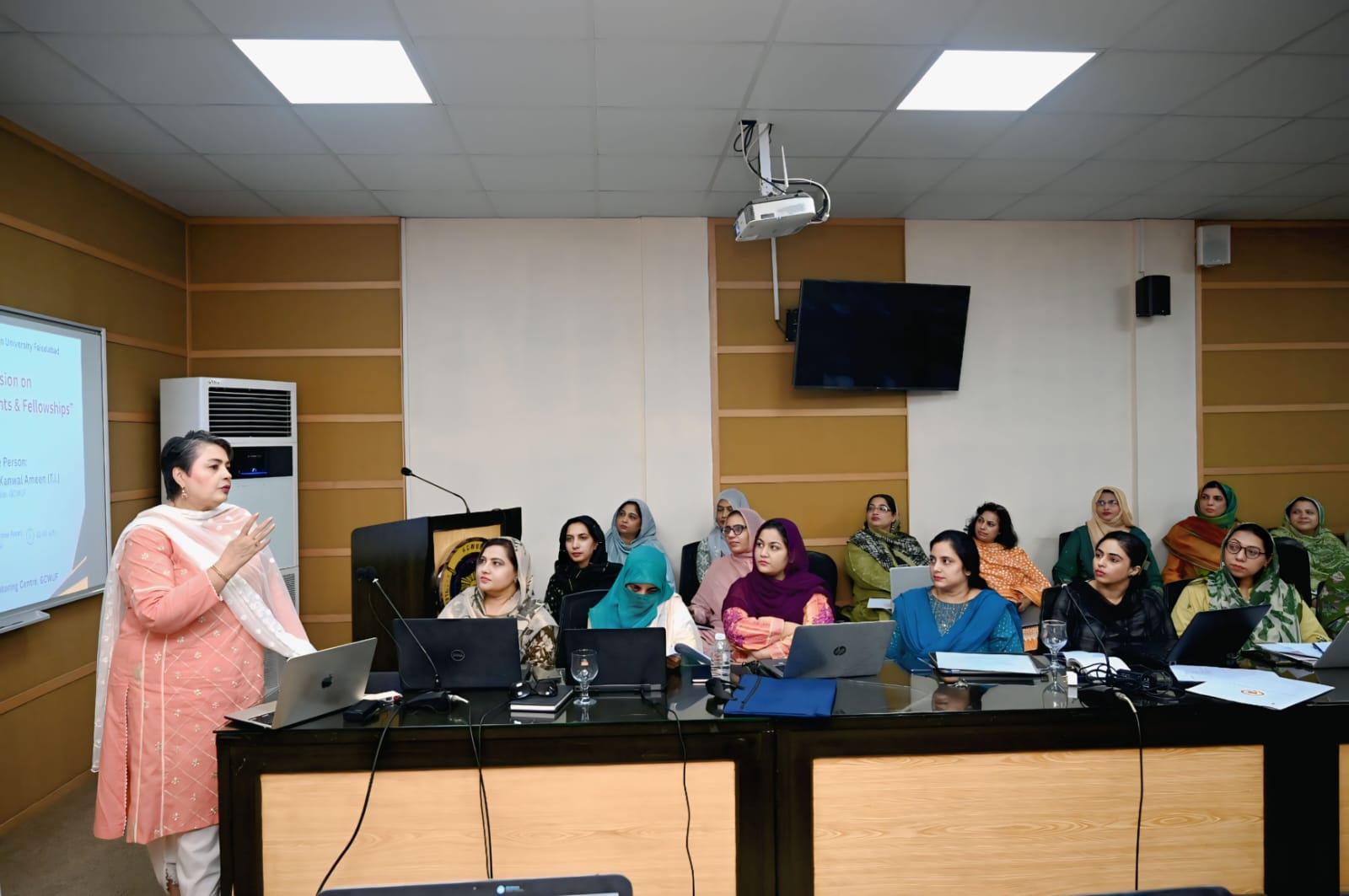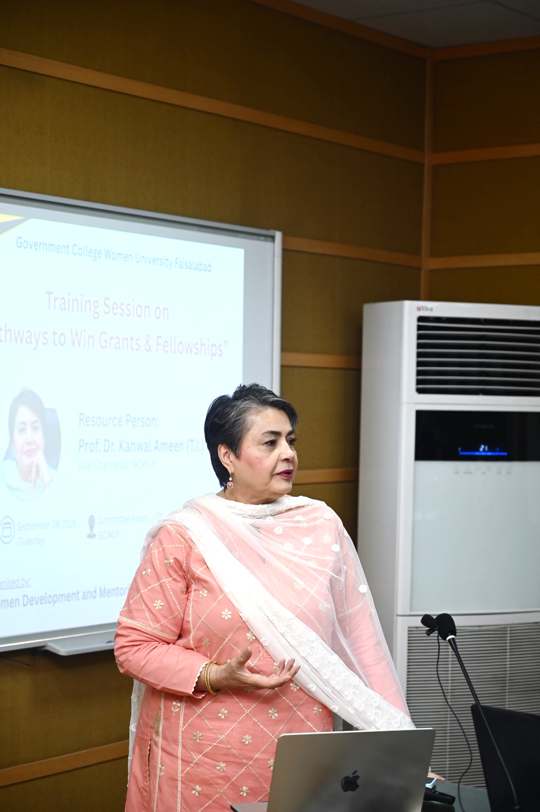 Vice Chancellor GCWUF Prof. Dr. Kanwal Ameen Conducts a Workshop for Faculty on Winning Grants & FellowshipsÚFaisalabad (September 9, 2025) — Prof. Dr. Kanwal Ameen (T.I.), Vice Chancellor Government College Women University Faisalabad, conducted a workshop for faculty members on “Pathways to Win Grants & Fellowships.” The session was organized under the Women Development and Mentoring Centre, GCWUF.ÚFollowing her mentorship vision, Dr. Ameen shared her rich experiences and enlightened the audience about strategies for identifying grant and fellowship opportunities. She guided the participants on preparing viable proposals, highlighting key steps for success and stressing the importance of staying connected with global academic and research developments across disciplines. She further emphasized that pursuing grants and fellowships is essential for both professional advancement and scholarly growth.ÚAt the conclusion of the workshop, Pro Vice Chancellor Prof. Dr. Zill-i-Huma Nazli expressed gratitude on behalf of the faculty, appreciating the Vice Chancellor’s mentorship in addition to her leadership role in university governance.