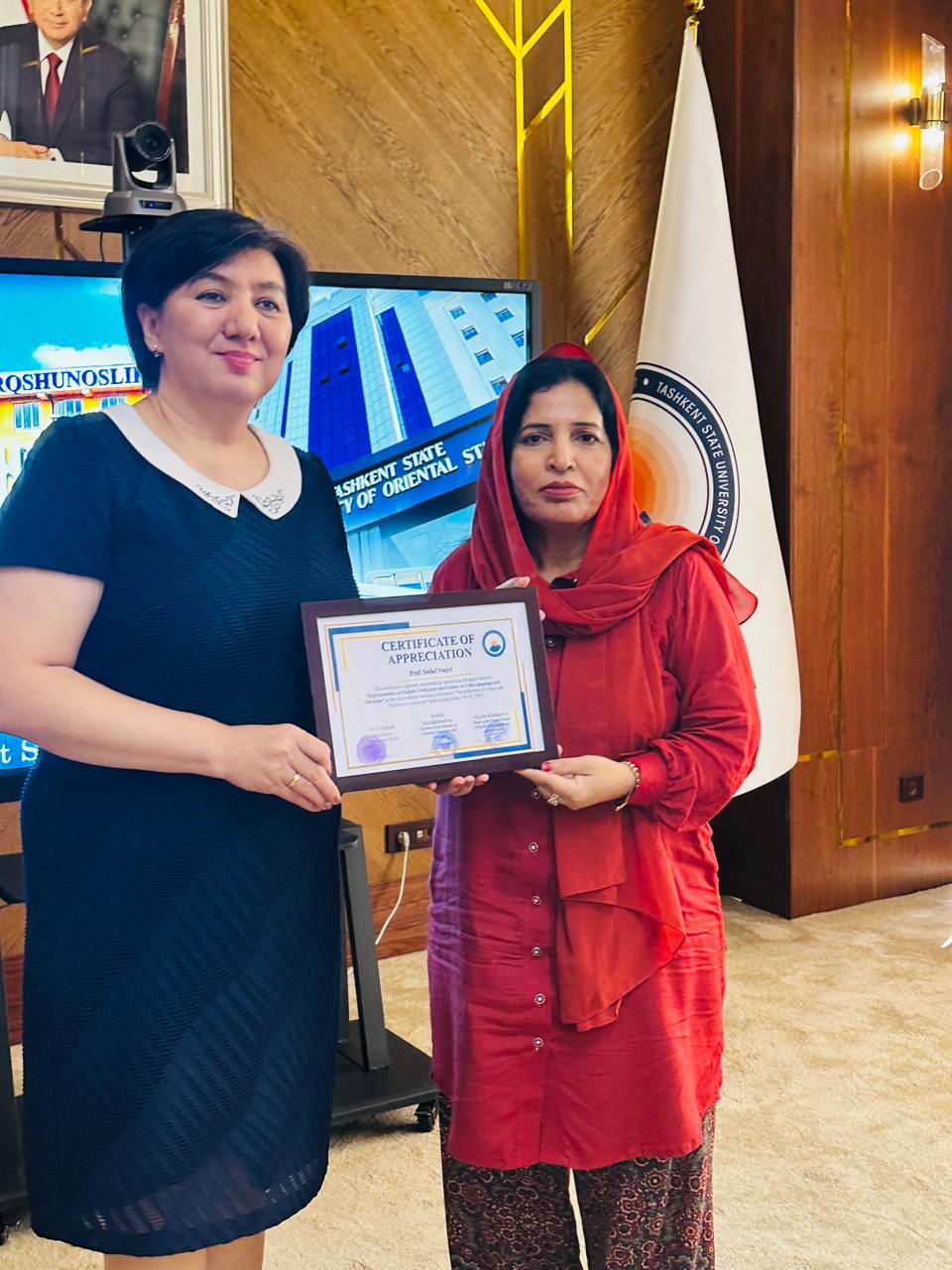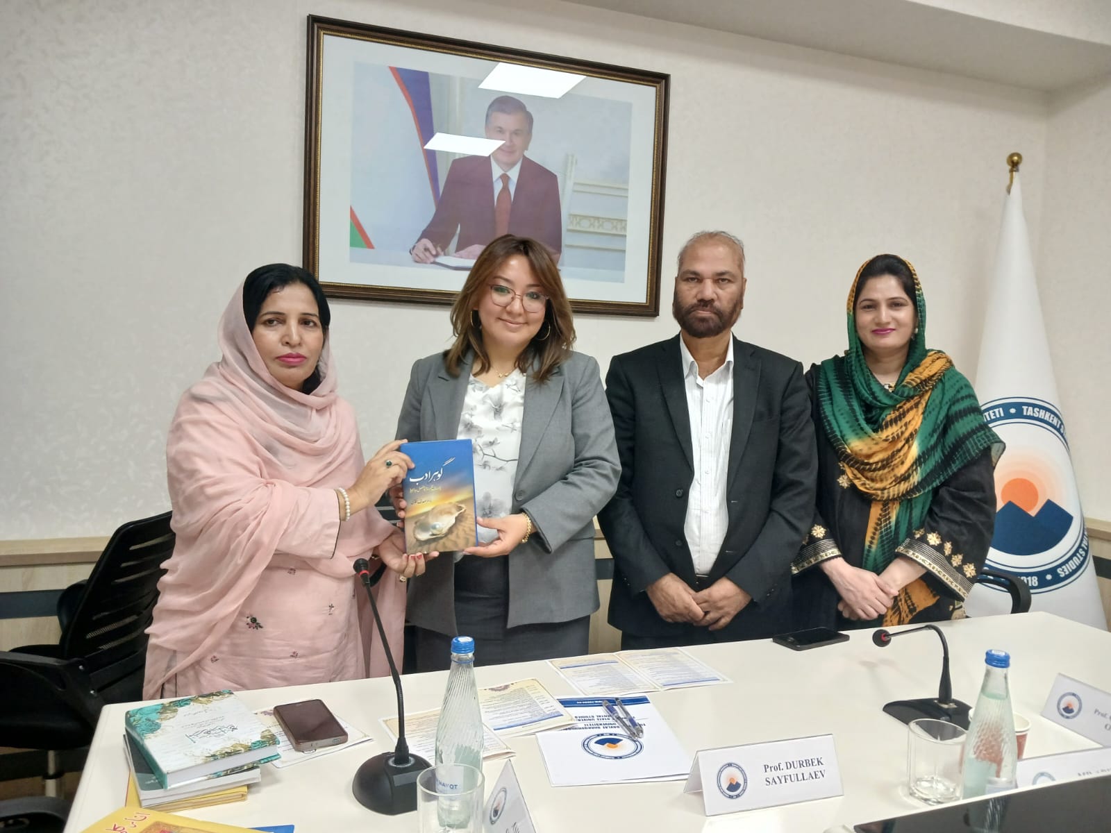 Dr. Sadaf Naqvi Participates in International Conference at Tashkent State UniversitySeptember 18–19, 2025 — Dr. Sadaf Naqvi, Assistant Professor of Urdu, Head of the Department of Media & Communication Studies, and In-charge of the Women Development & Mentoring Centre at Government College Women University Faisalabad (GCWUF), participated in a two-day international conference on “Reflection of Culture and Civilization in Literature” organized by Tashkent State University of Oriental Languages.Delegates from Pakistan, India, Iran, and Uzbekistan presented over 40 papers in Urdu, Hindi, English, and Uzbek. Dr. Naqvi presented her paper “Punjabi Culture in the Mirror of Urdu Poetry.” Rector Prof. Gulchehra distributed certificates to the participants and emphasized the importance of strengthening academic and literary collaborations.Dr. Naqvi also donated her authored books to the Tashkent State University library. The conference concluded with scholarly exchanges and cultural visits to historic cities including Tashkent, Samarkand, and Bukhara.
