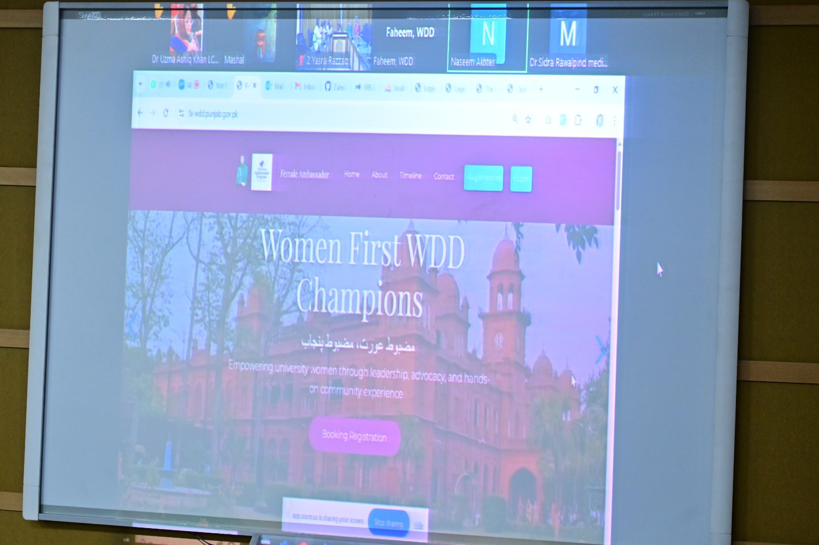 GCWUF WDMC Joins Hybrid Meeting on Young Female Ambassador ProgramSept. 30, 2025 — The Women Development and Mentoring Centre (WDMC), GCWUF, participated in a hybrid meeting of the Young Female Ambassador Program organized by the Women Development Department, Punjab. Led by Dr. Sadaf Naqvi, In-charge WDMC, with committee members Dr. Hira Munir, Dr. Ayesha Younus, Dr. Ayesha Imtiaz, Dr. Gul Sana, and Dr. Saiqa Sadiq, the session brought together focal persons from 45 universities across Punjab. Dr. Naqvi informed organizers that GCWUF is fully prepared for the upcoming online test on October 2, with labs reserved and wide student participation expected. She assured smooth management of the test and subsequent interviews, reaffirming WDMC’s commitment to the program’s successful execution.