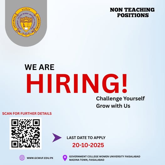 Non-Teaching Positions Open at GCWUF!Are you ready to challenge yourself and grow with one of Pakistan’s leading women’s universities? Grow with us and contribute to a vibrant, empowering academic environment! Vacancies: Multiple exciting non-teaching roles📅 Last Date to Apply: 20-10-2025📍 Location: Government College Women University Faisalabad, Madina Town, Faisalabad🔗 Scan the QR code on the poster or visit 👉 www.gcwuf.edu.pk for details and to apply!Don’t miss this opportunity – your next career move awaits!