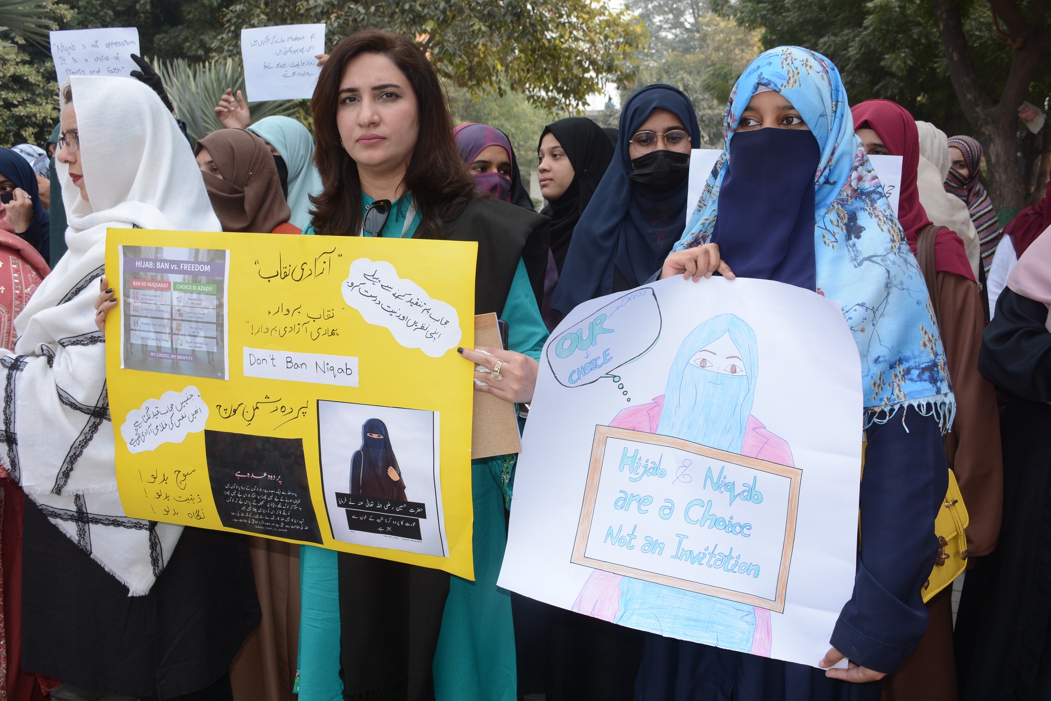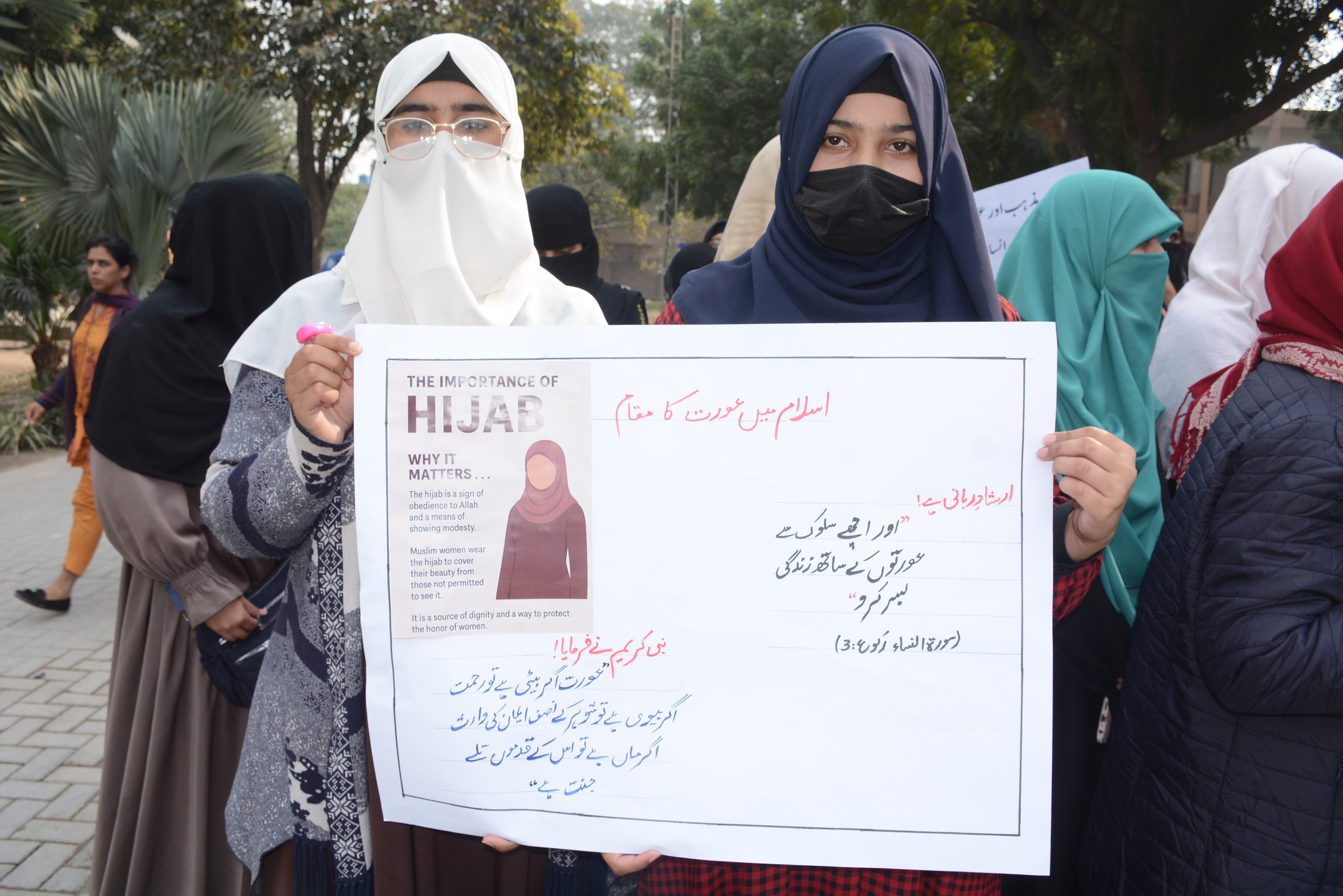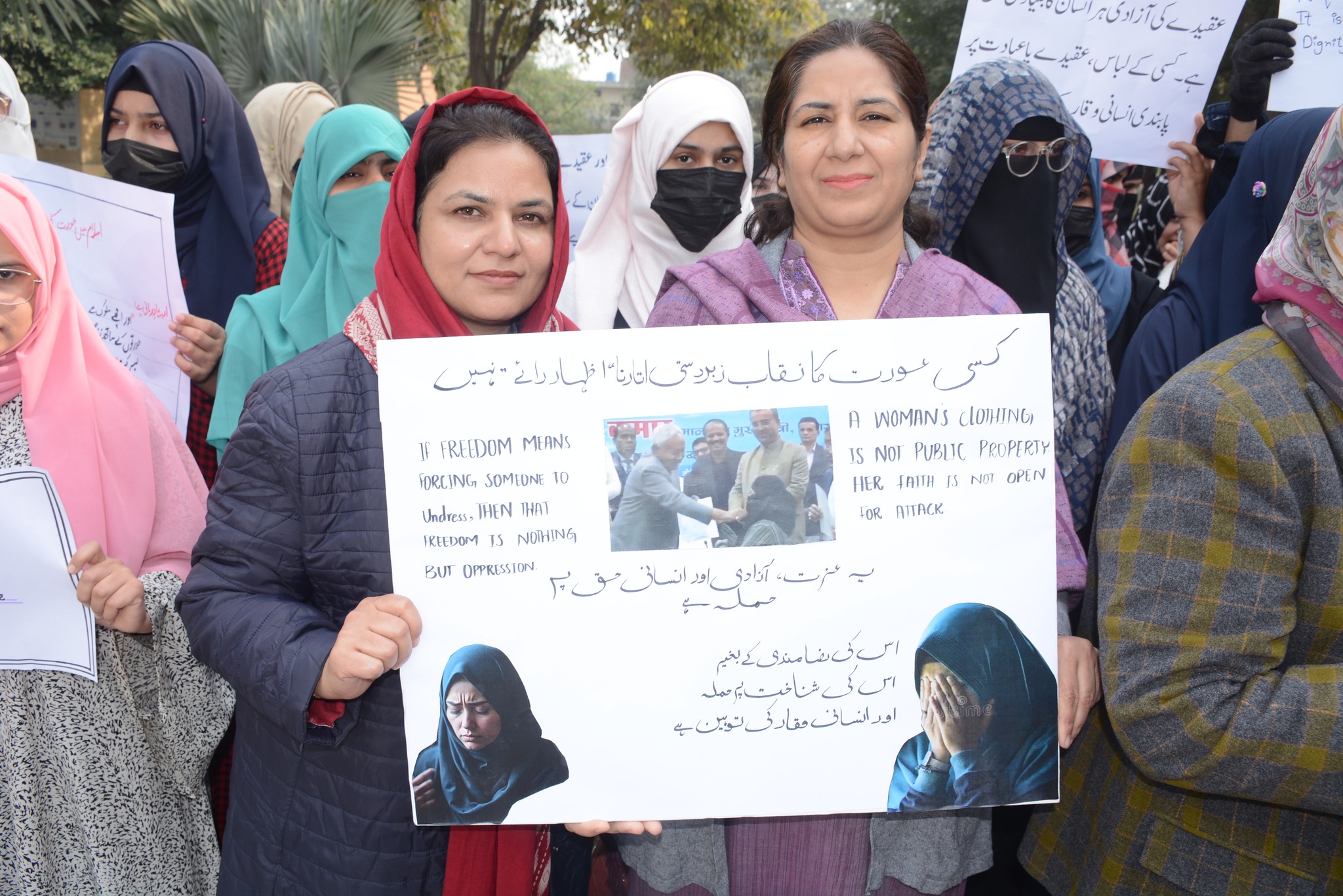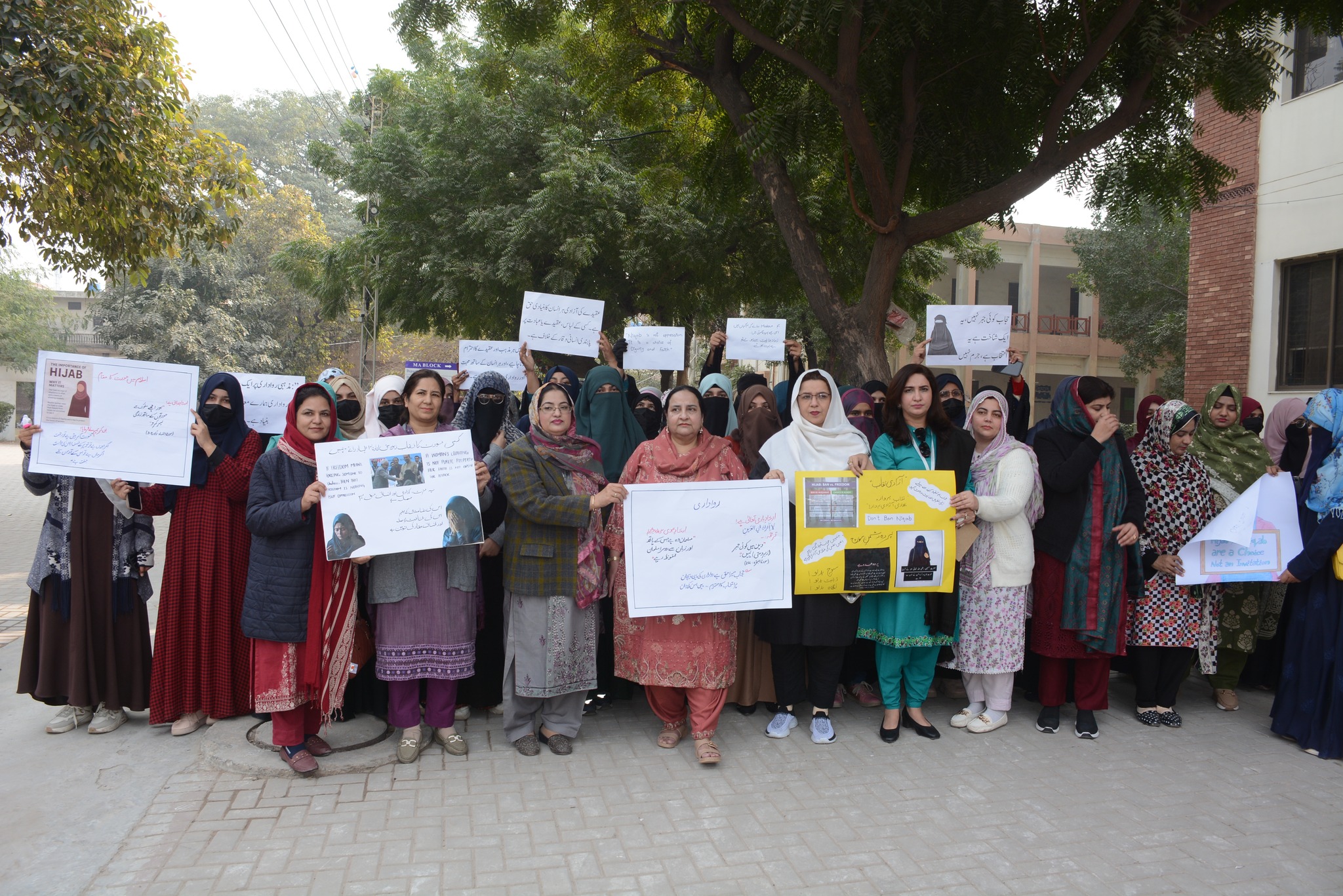 A peaceful protest was organized by the students and faculty of the Government College Women University Faisalabad to strongly denounce discrimination, public humiliation, and violations of women’s dignity. The university community reaffirmed its collective commitment to women’s autonomy, religious tolerance, and the protection of minority rights.ÚThe protest was held in response to a reported incident in Bihar, India, where a woman’s veil was forcibly removed during an official ceremony—an act widely viewed as a grave violation of personal dignity, religious freedom, and fundamental human rights.