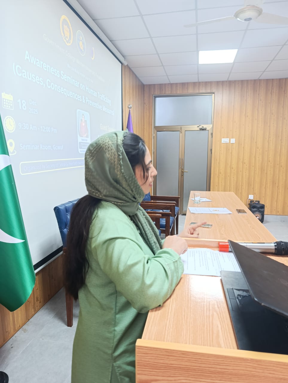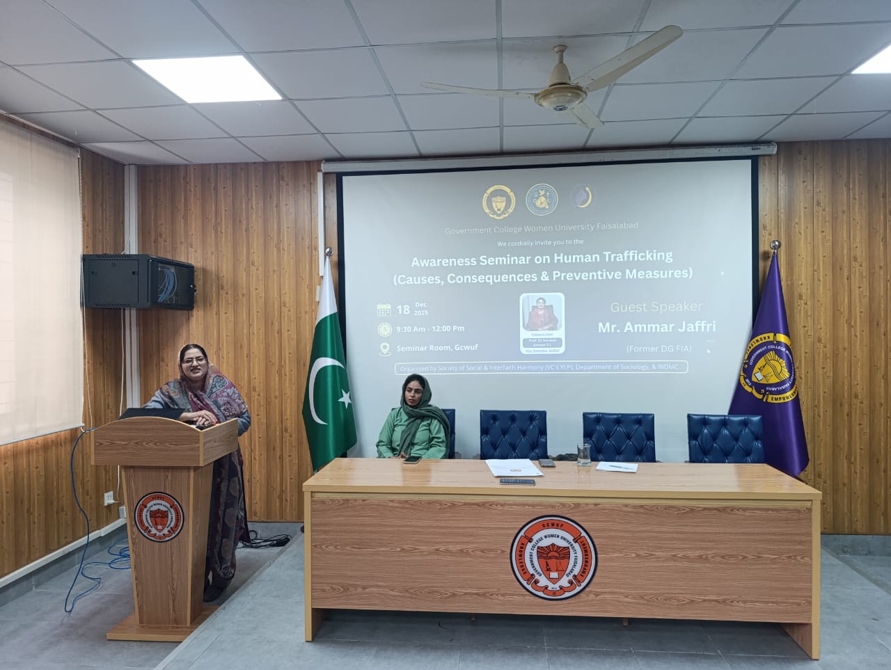 Awareness Seminar on Human Trafficking | GCWUFÚOn 18 December 2025, Government College Women University Faisalabad organised an awareness seminar on Human Trafficking: Causes, Consequences & Prevention at Fatima Block. Organized jointly by the Society of Social & Interfaith Harmony, DSA, and WDMC, the session featured insightful talks by Dr. Abida Kausar on causes and emotional impact—especially on young girls—and Dr. Asma Aziz on societal consequences and prevention, followed by an interactive Q&A with students.