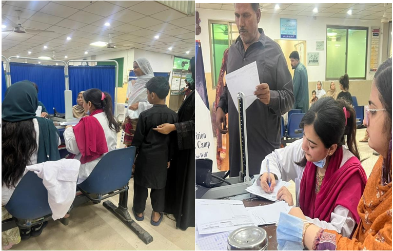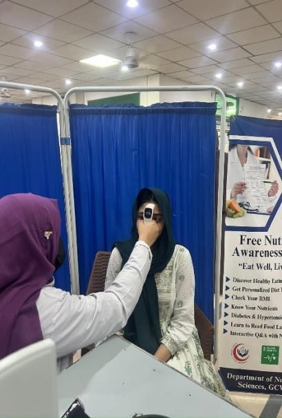 The Department of Nutritional Sciences, Government College Women University Faisalabad (GCWUF), organized a Free Nutrition Awareness Camp on 12 May 2025 at Mujahid Hospital, Faisalabad, under the theme Empowering Communities Through Nutrition Advancing SDG 3: Good Health and Well-Being. The camp aimed to promote nutritional literacy, preventive healthcare, and community well-being in alignment with the United Nations Sustainable Development Goal 3. Services provided included free nutritional assessments (BMI, body fat analysis, waist-to-hip ratio), health screenings (blood pressure, glucose, temperature, oxygen saturation), and personalized diet counseling tailored to age, lifestyle, and medical needs. The initiative also addressed key nutrition-related concerns such as obesity, malnutrition, diabetes, hypertension, and anemia, while engaging GCWUF students in practical community outreach. The activity was well-received and marked a significant step toward improving public health outcomes through nutrition education.