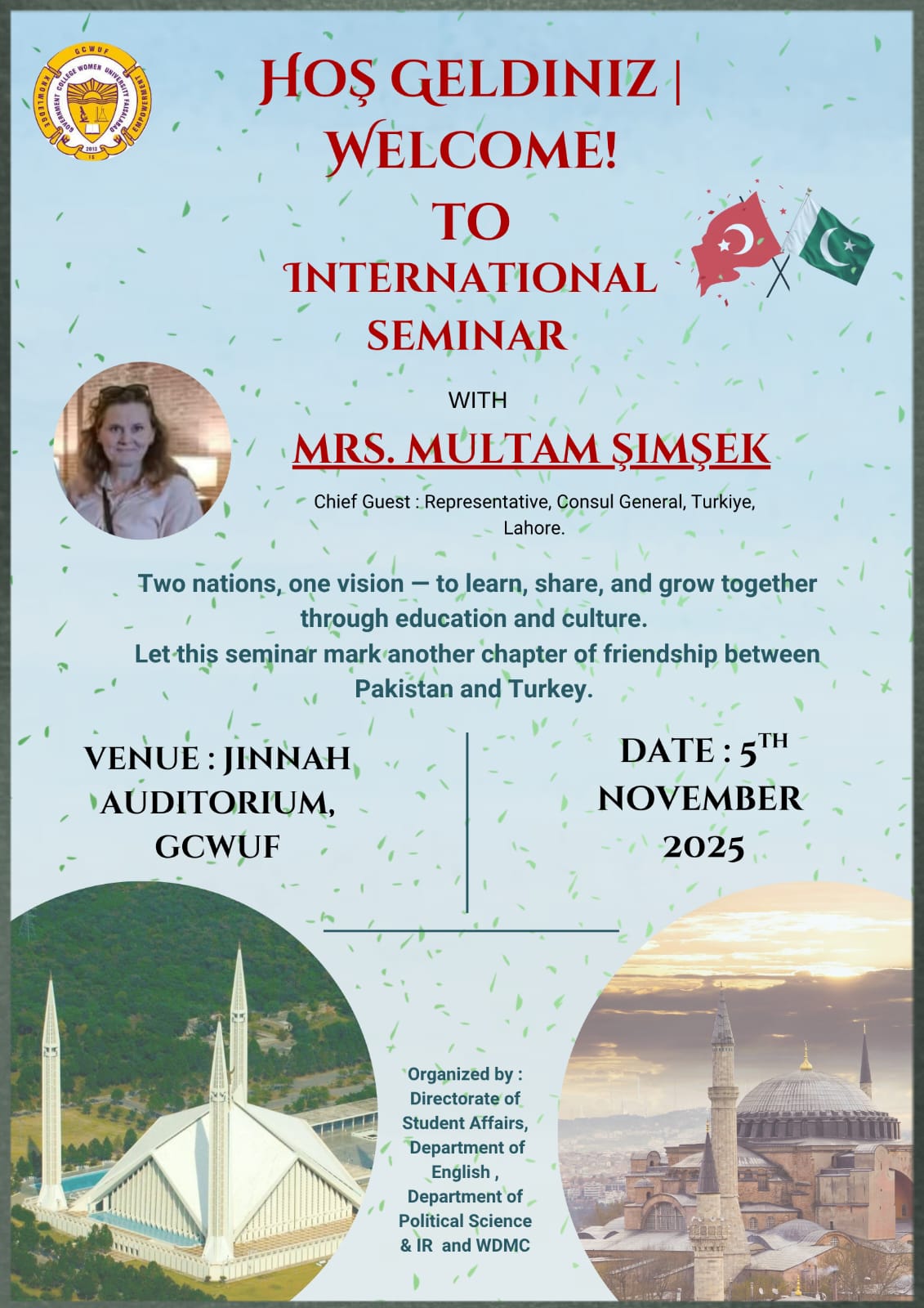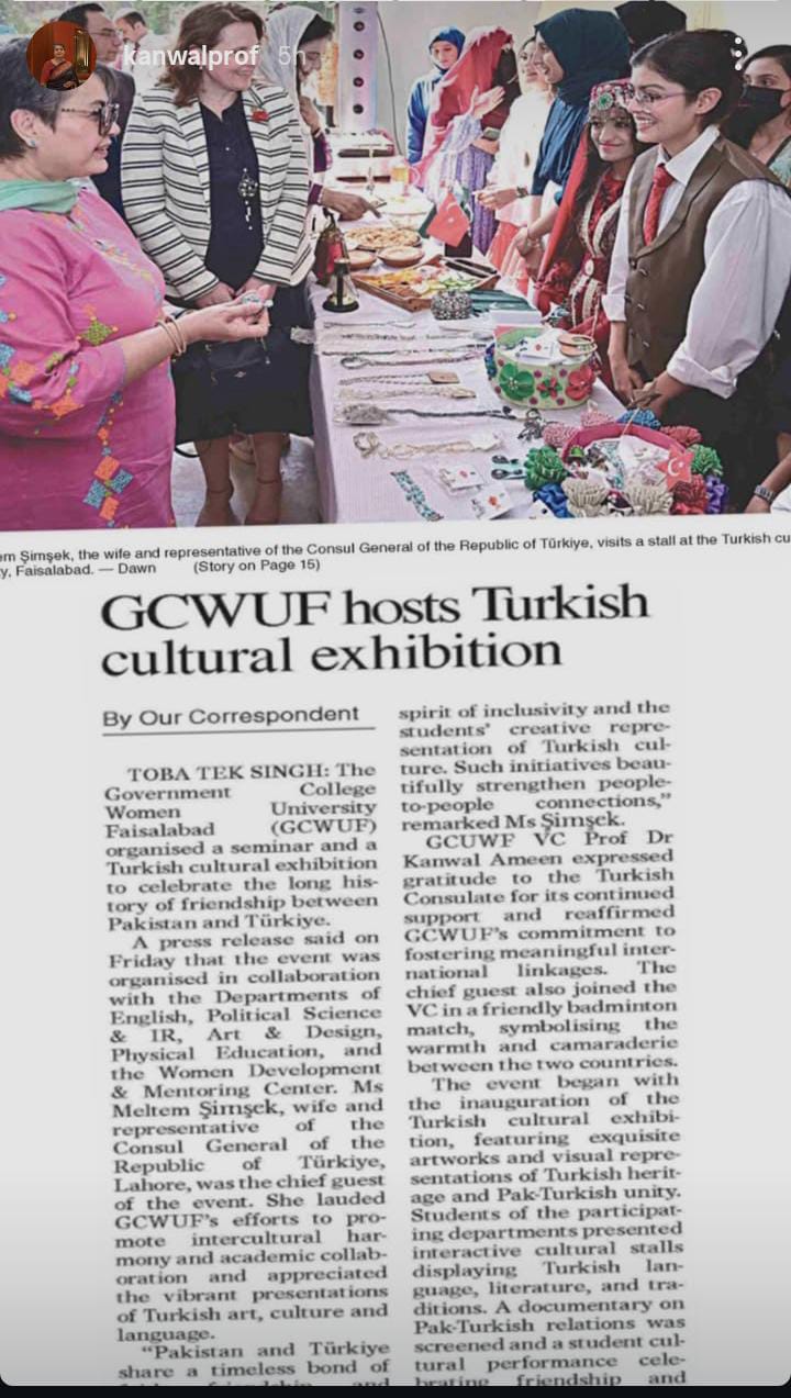 The Directorate of Student Affairs in collaboration with the Departments of English and Political Science & IR, the Women Development & Mentoring Center, Media Society, and Sports Society, organized an International Seminar and Turkish Cultural Exhibition, in connection with the Turkish Republic Day (29th October) under the patronage of the Worthy Vice Chancellor, Prof Dr Kanwal Ameen on 5th November 2025 Chief Guest: Mrs. Meltem ??im??ek, Wife of the Consul General, Republic of T??rkiye, Lahore