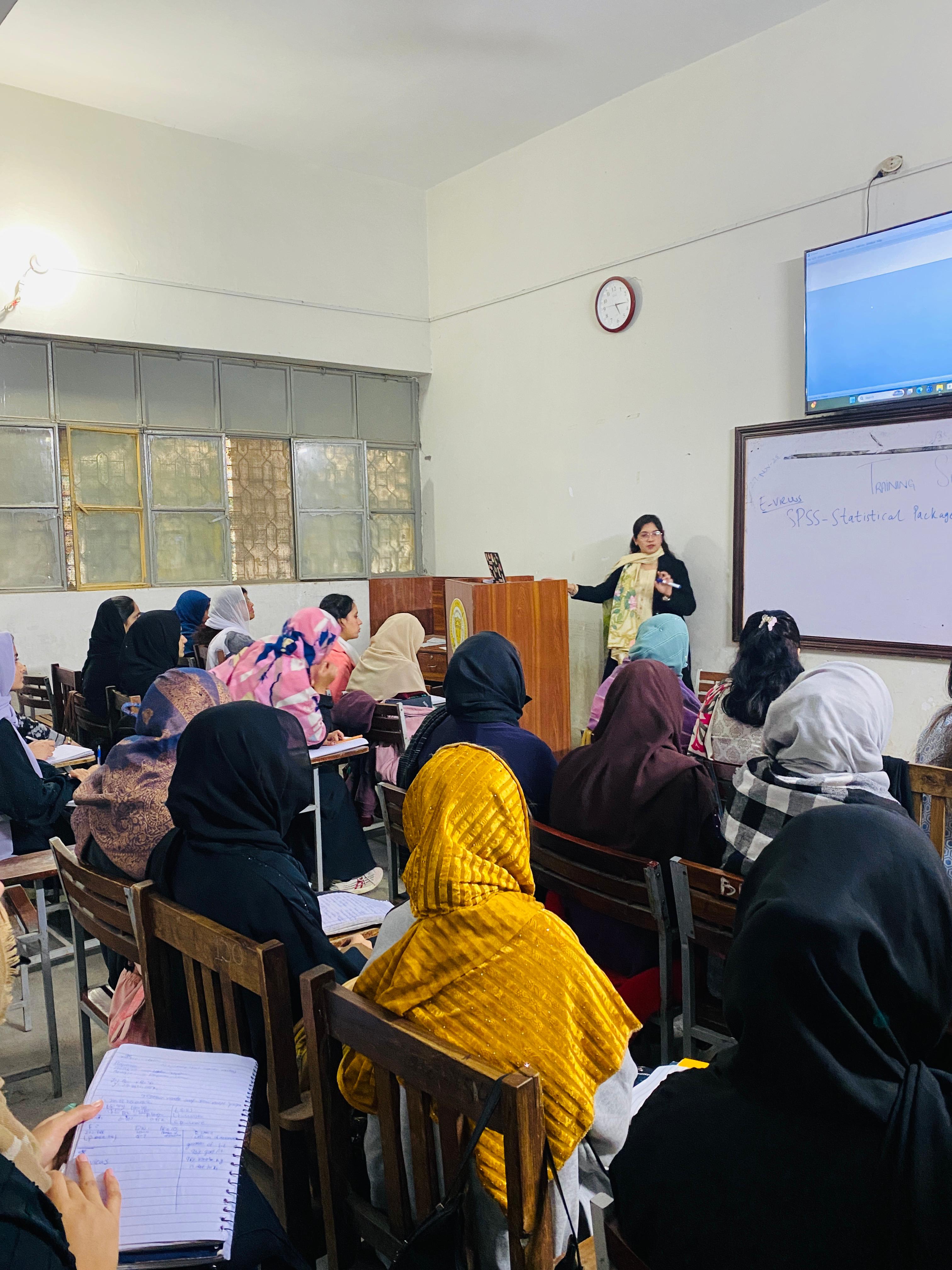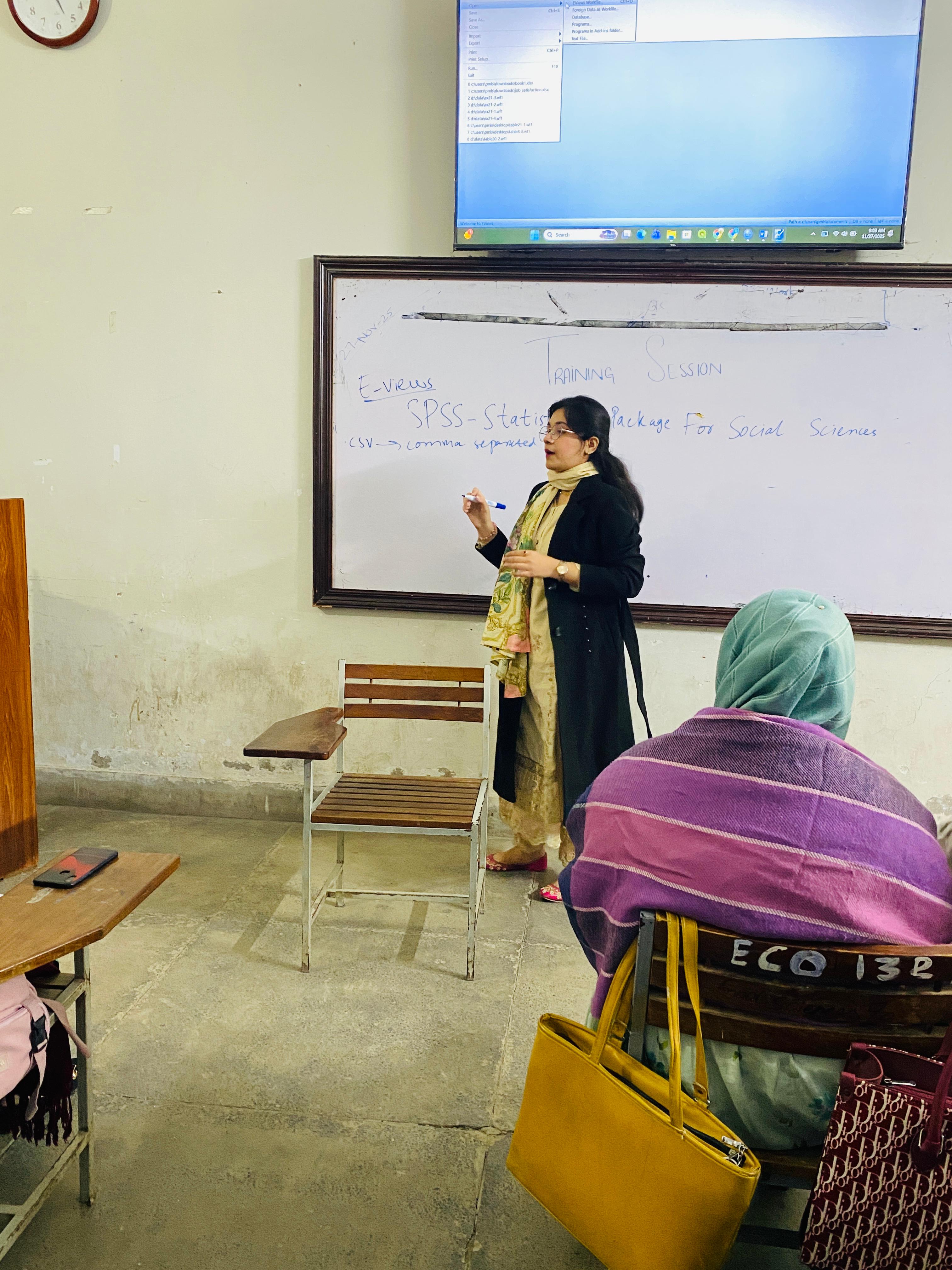 Kashaf Tanveer taught students of the Department of Public Administration at Government College Women University (GCWU), Faisalabad. She conducted training sessions on research and data analysis software, including SPSS and EViews, focusing on data entry, descriptive statistics, regression analysis, and various statistical tests used for research analysis. She also introduced students to Google BigQuery (SQL language) to enhance their understanding of modern data handling techniques. Her sessions emphasized practical learning and were appreciated by the students for improving their analytical and research skills.