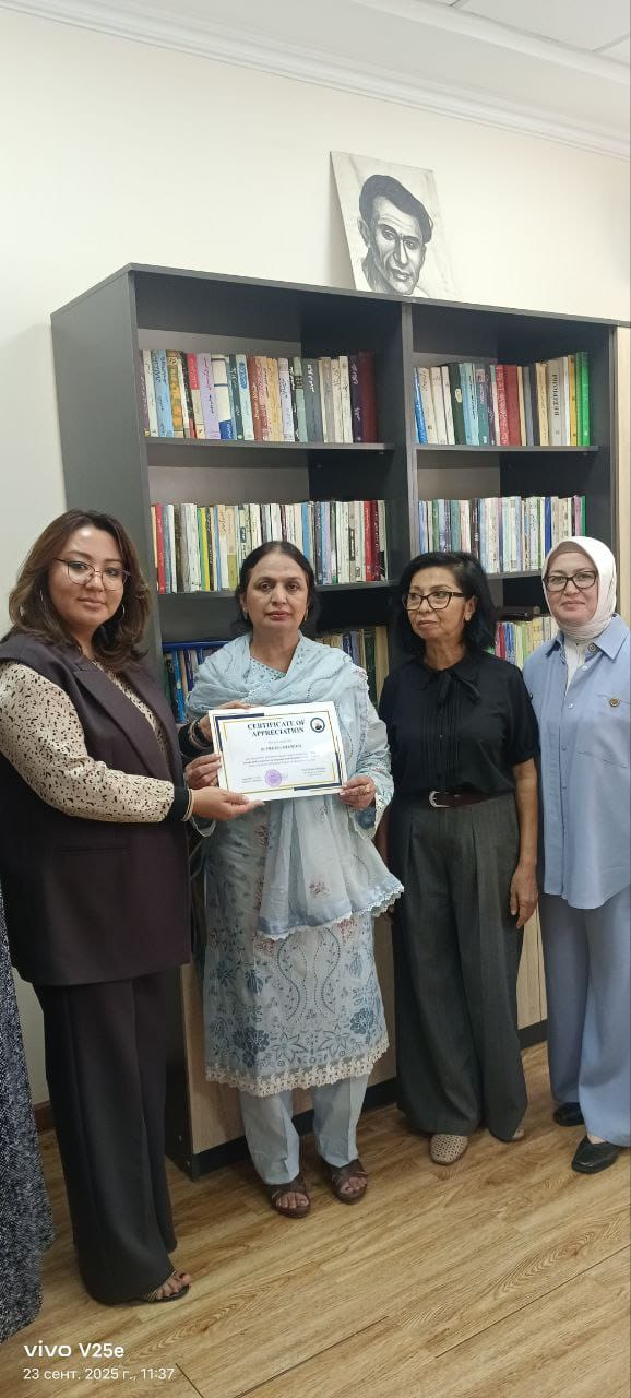 Dr. Imrana Shahzadi Represents GCWUF at the International Conference in UzbekistanÚSeptember 18–19, 2025 — Dr. Imrana Shahzadi, Head of the Department of Arabic, Government College Women University Faisalabad (GCWUF), participated in the two-day international conference “Reflection of Culture and Civilization in Literature” hosted by the Centre of South Asian Languages and Literature at Tashkent State University of Oriental Languages.ÚThe conference, attended by scholars from Pakistan, India, Iran, and Uzbekistan, featured nearly 40 papers in Urdu, Hindi, English, and Uzbek. Dr. Shahzadi presented her research on “Culture in Arabic Literature,” contributing valuable insights to the academic discourse. Rector Prof. Gulchehra awarded certificates to participants and underscored the importance of strengthening inter-university collaboration.