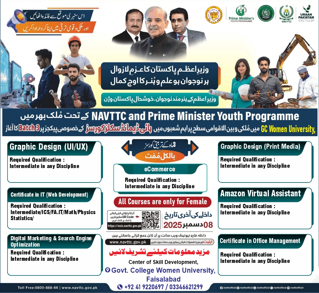 Admissions Open!GC Women University Faisalabad proudly announces Free Training Courses under NAVTTC & Prime Minister Youth Programme (PMYP) — Batch 03!💥 ONLY FOR FEMALE candidates📍 Venue for Admission Queries: e-Rozgaar Lab, Center of Skills Development, GCWUF📅 Last Date to Apply: 8 December 2025🌐 Apply Online: https://nsis.navttc.gov.pk🎓 Offered Courses & Timings1️⃣ Amazon Virtual Assistant (VA)📘 Eligibility: Intermediate in any discipline⏰ 12:00 PM – 4:00 PM2️⃣ Certificate in IT (Web Development)📘 Eligibility: Intermediate / ICS / FA / IT / Math / Physics / Statistics⏰ 9:00 AM – 1:00 PM3️⃣ Digital Marketing & SEO📘 Eligibility: Intermediate in any discipline⏰ 9:00 AM – 1:00 PM4️⃣ eCommerce📘 Eligibility: Intermediate in any discipline⏰ 12:00 PM – 4:00 PM5️⃣ Graphic Design (Print Media)📘 Eligibility: Intermediate in any discipline⏰ 9:00 AM – 1:00 PM6️⃣ Graphic Design (UI/UX)📘 Eligibility: Intermediate in any discipline⏰ 12:00 PM – 4:00 PM7️⃣ Certificate in Office Management📘 Eligibility: Intermediate in any discipline⏰ 2:00 PM – 5:00 PM☎️ Contact: 042-9220697 / 0334-6621299 (WhatsApp only)📍 GC Women University Faisalabad📌 Disclaimer: The class timetable is tentative and may be changed by the university based on administrative requirements.