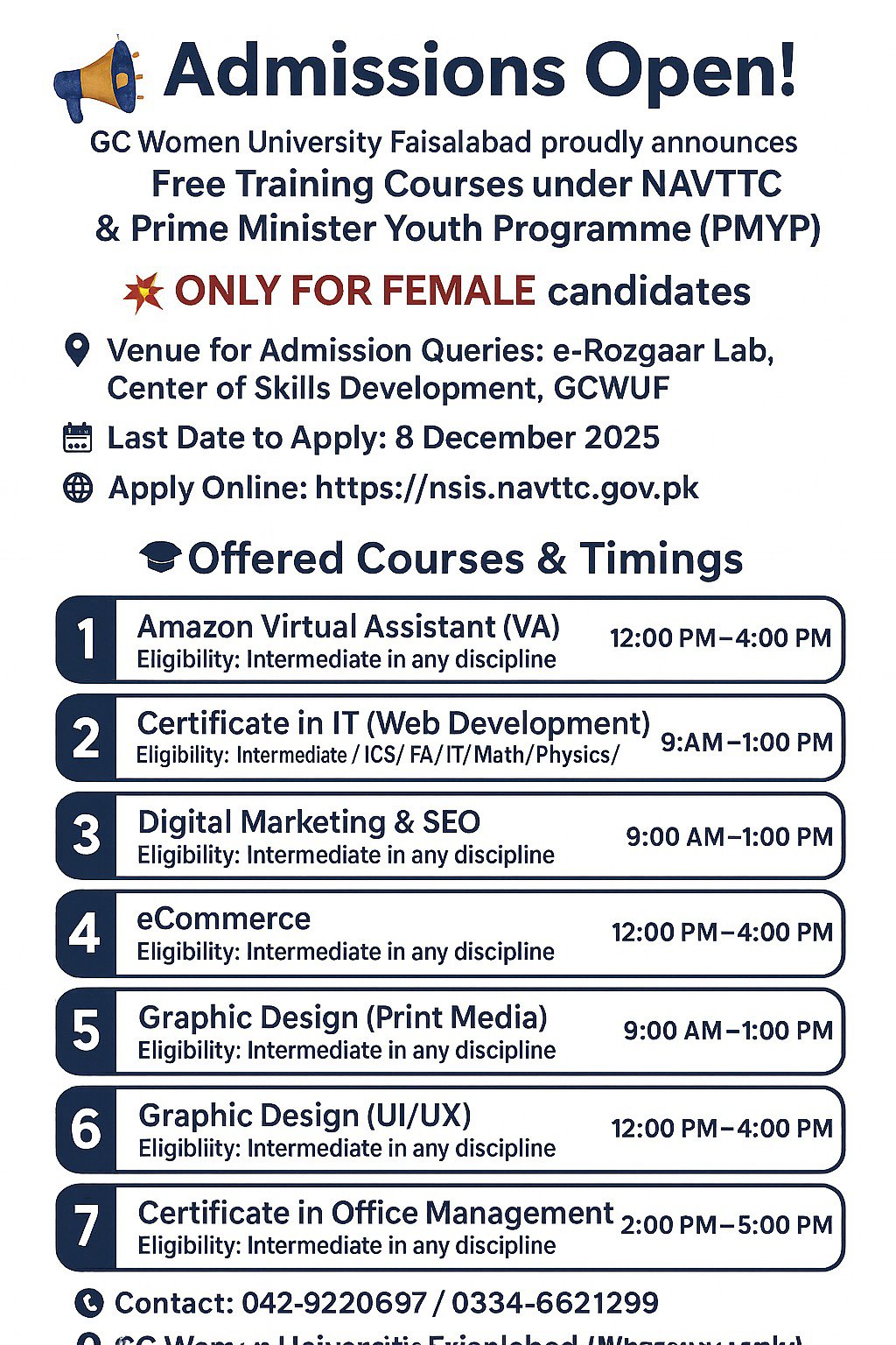 GC Women University Faisalabad proudly announces Free Training Courses under NAVTTC & Prime Minister Youth Programme (PMYP) — Batch 03!