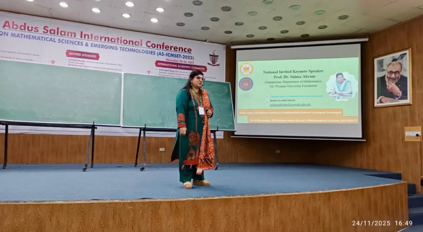 Prof. Dr. Saima Akram Chairs Scientific Sessions at Global Mathematics ConferenceฺFAISALABAD, November 26, 2025 โ Prof. Dr. Saima Akram, Chairperson of the Department of Mathematics and Coordinator, Faculty of Computing & Numerical Sciences at Government College Women University Faisalabad, represented the University as an invited speaker at the Abdus Salam International Conference on Mathematical Sciences & Emerging Technologies (AS-ICMSET-2025), held at ASSMS, GC University Lahore. She delivered an invited talk titled โOptimal Derivative-Free Iterative Methods for Nonlinear Equations: Bridging Mathematical Theory and Physical Realityโ and chaired scientific sessions alongside distinguished international mathematicians. Her participation highlights GCWUFโs strong research culture and growing academic visibility, supported by the Universityโs continued emphasis on faculty development and research excellence.