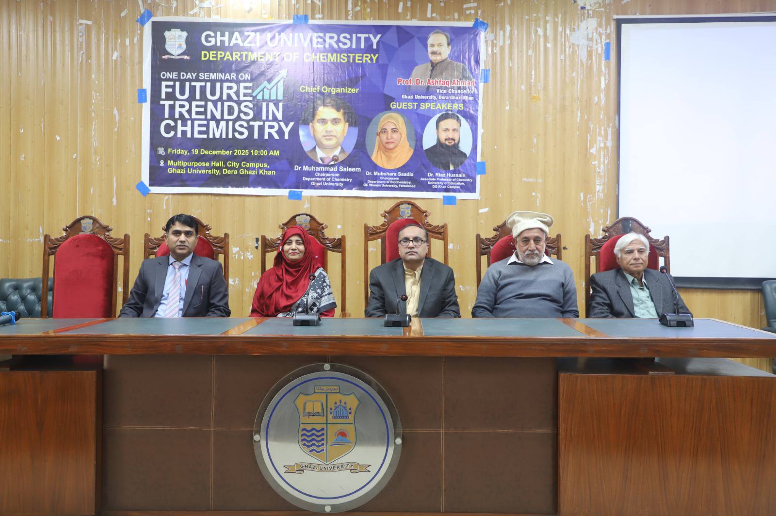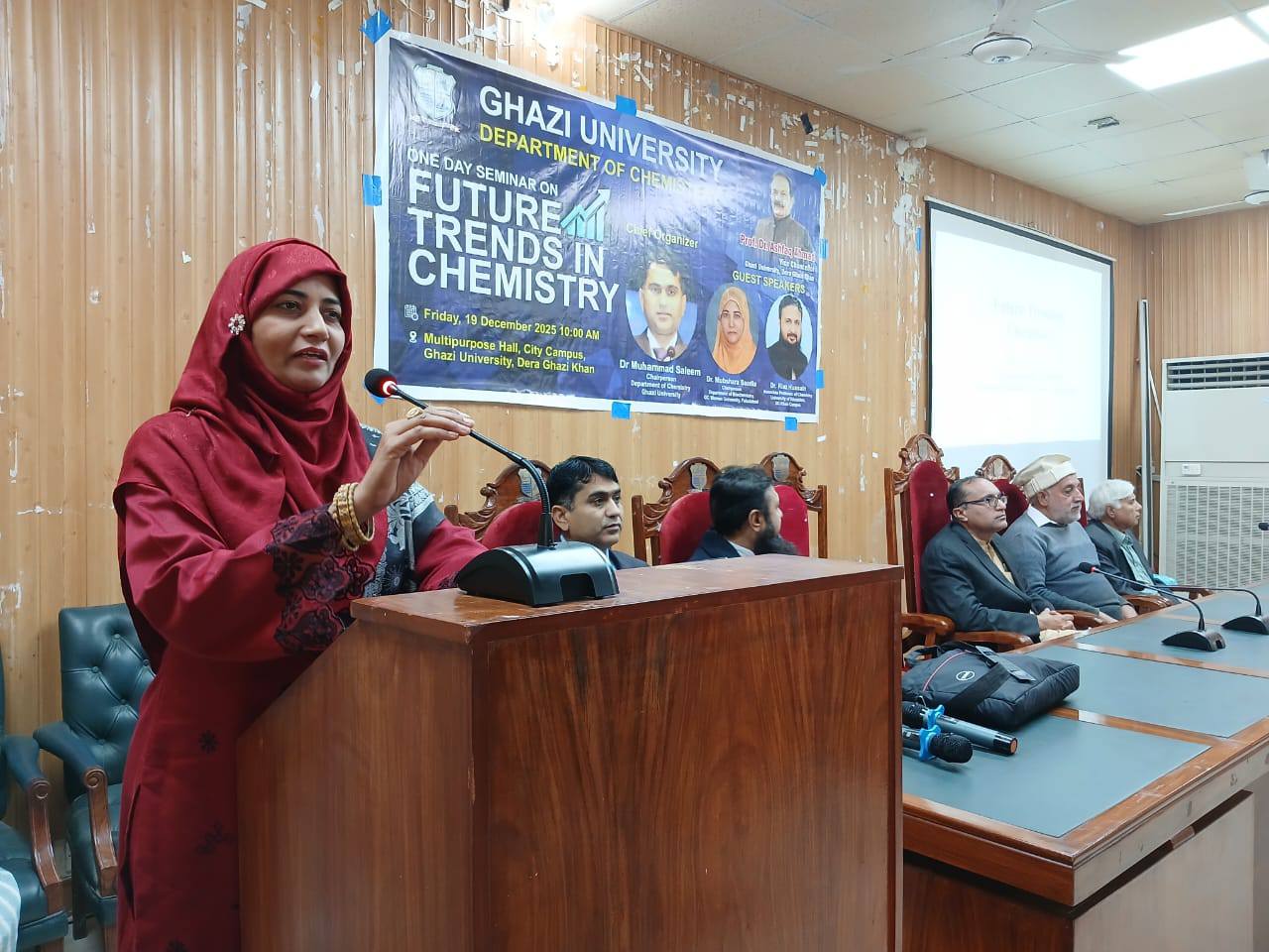 Dr. Mubashra Sadia Delivers a Talk on Future Trends in ChemistryÚChairperson, Department of Biochemistry, Dr. Mubashra Saadia represented Government College Women University Faisalabad as a guest speaker at a one-day academic seminar titled “Future Trends in Chemistry” hosted by Ghazi University. She delivered an expert talk on the integration of chemistry and biochemistry, highlighting advances in molecular research and the application of AI in chemical and biological sciences, while also serving as an external examiner.