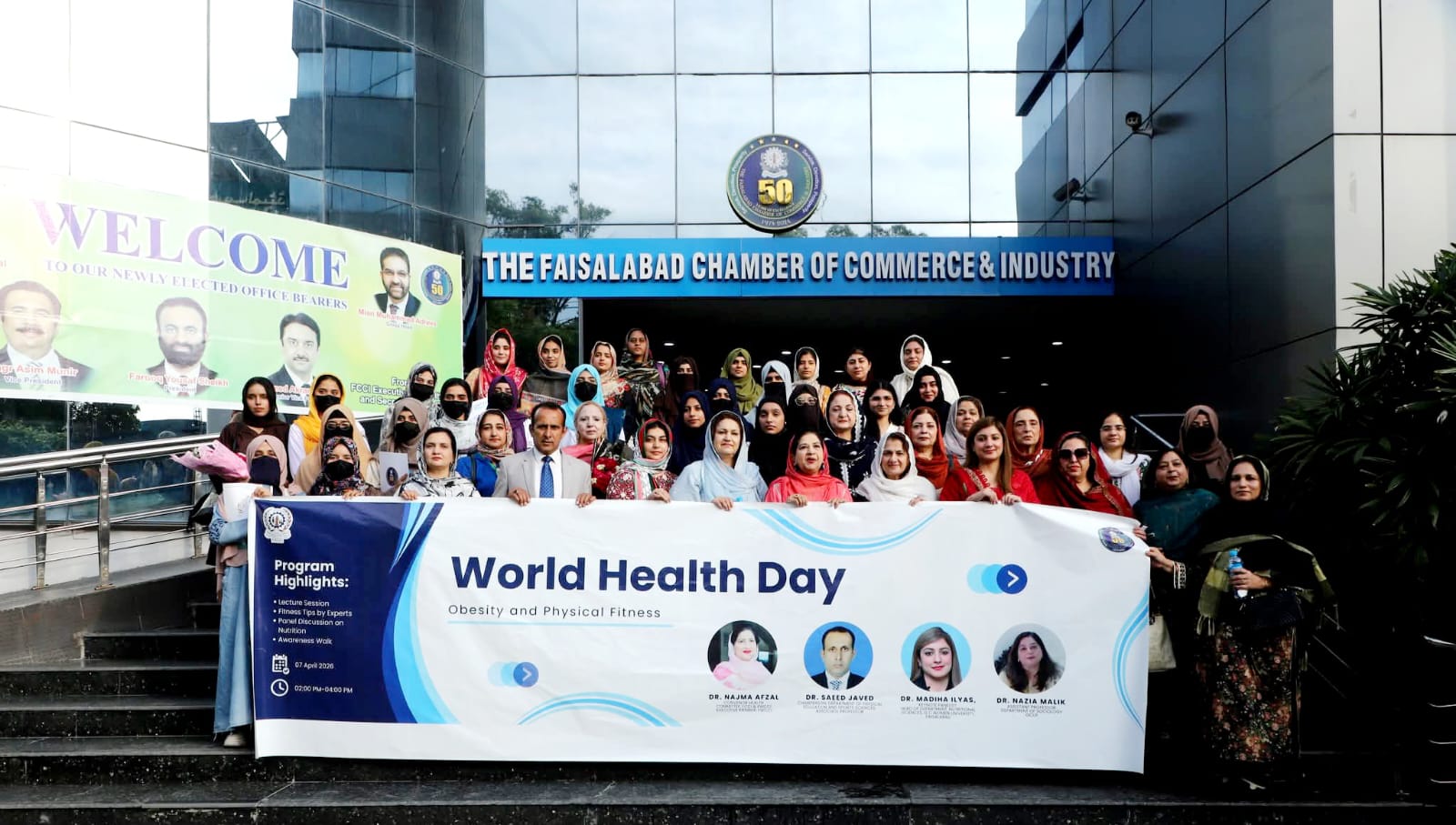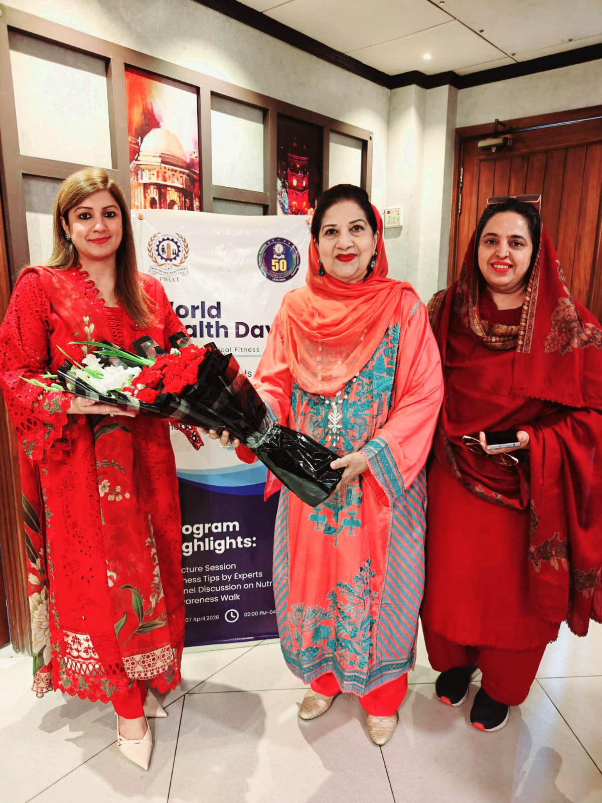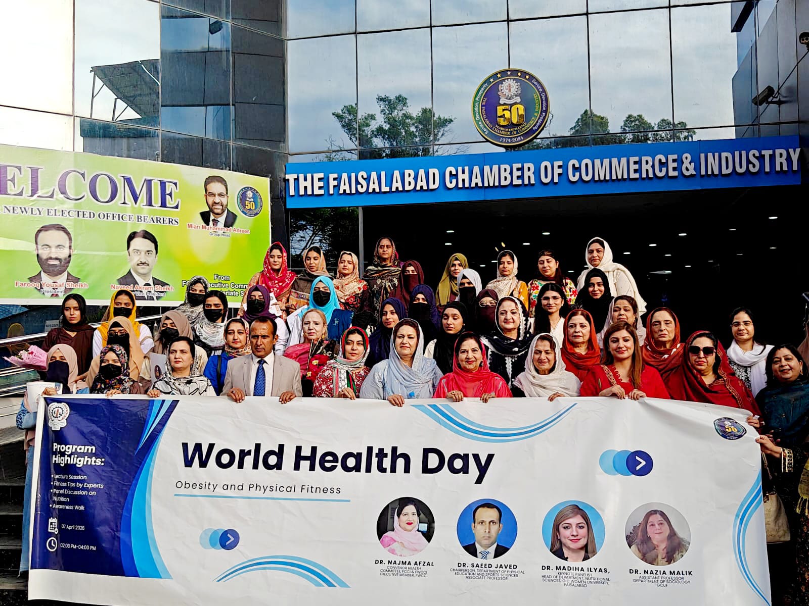 Dr. Madiha Ilyas, Head of Department, Nutritional Sciences, Government College Women University, Faisalabad, participated as Keynote Panelist at World Health Day Seminar on “Obesity and Physical Fitness”, organized by the Standing Health Committee of the Faisalabad Women Chamber of Commerce and Industry (FWCCI) and the Faisalabad Chamber of Commerce and Industry (FCCI) on 7th April 2026. During the expert panel discussion, she shared insightful views on the rising prevalence of obesity, its associated health risks, and evidence-based strategies for prevention and management. She particularly emphasized the importance of balanced nutrition, healthy dietary practices, regular physical activity, and long-term lifestyle modifications in addressing obesity and promoting overall well-being.The seminar brought together health professionals, academicians, industry representatives, and members of the community to raise awareness about the importance of physical fitness and healthy living. An awareness walk was also organized as part of the event to reinforce the message of adopting healthier lifestyles. The event successfully highlighted the urgent need to address obesity as a public health concern and encouraged collaborative efforts to build a healthier society